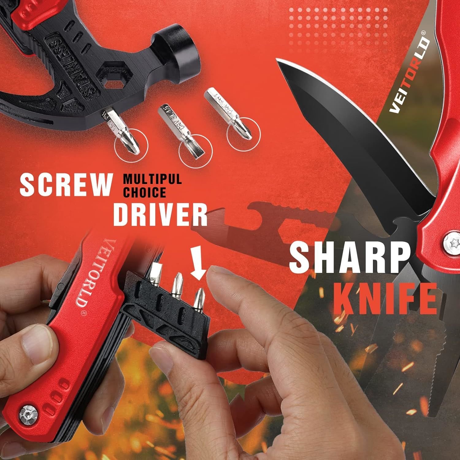 •More than A Hammer- Our 14-in-1 multitool includes compact hammer, pliers, different types of srewdrivers, sharp knife, nail claw, wire cutter, can opener, bottle opener, etc.