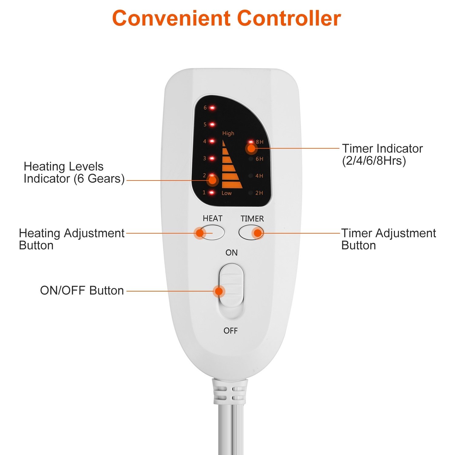 *4 Timer Settings*:There are 4 time settings on the controller; you can adjust 2/4/6/8hrs timer according to your needs. Overheat protection function makes it intelligently sense the temperature and automatically shut down when it reaches 60℃/ 140℉ to effectively avoiding burns and fire accidents. You can turn it off then turn on to use it again.
